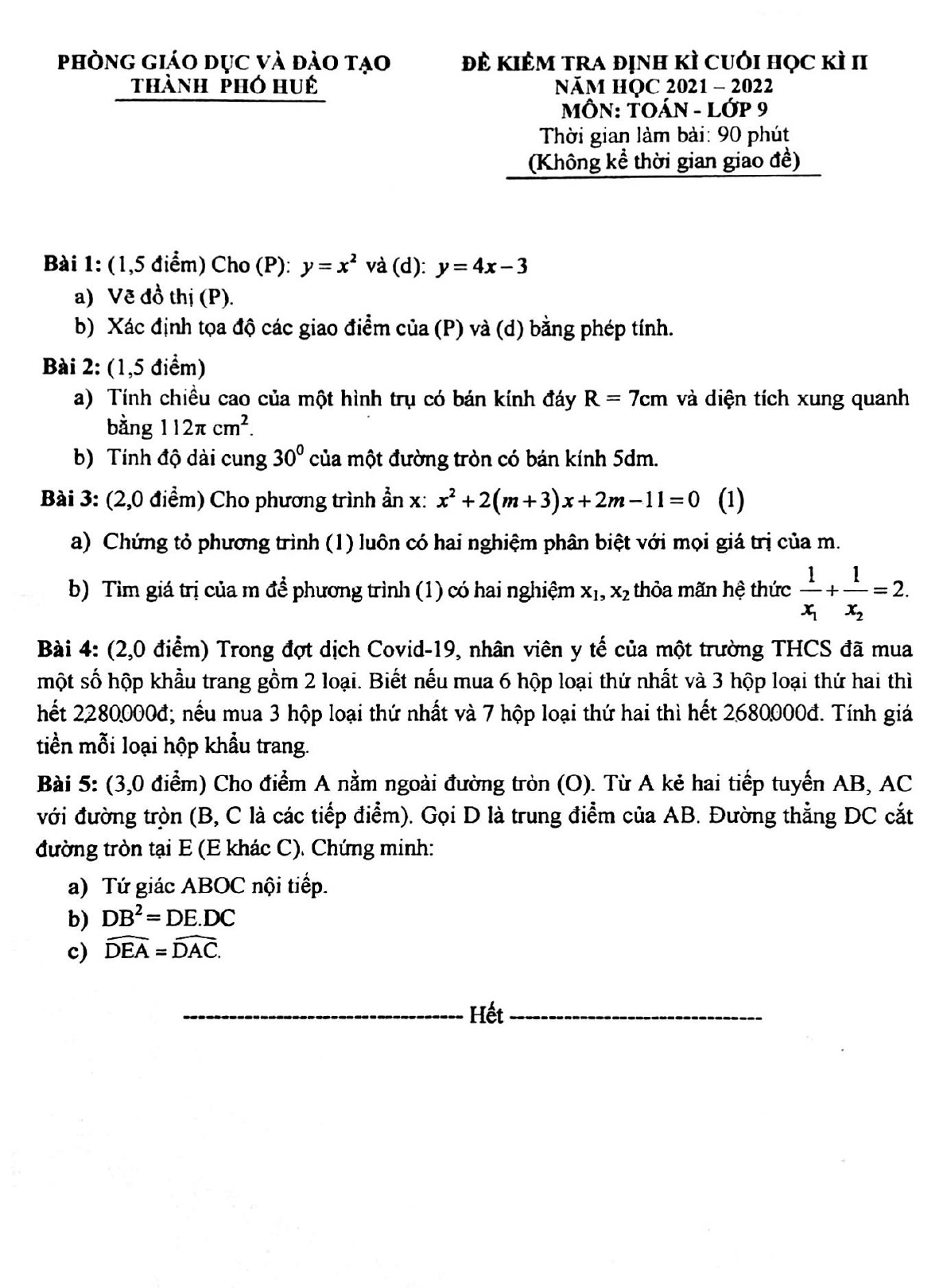 Đề thi học kì 2 lớp 9 môn Toán Phòng GD&ĐT TP Huế năm học 2021-2022