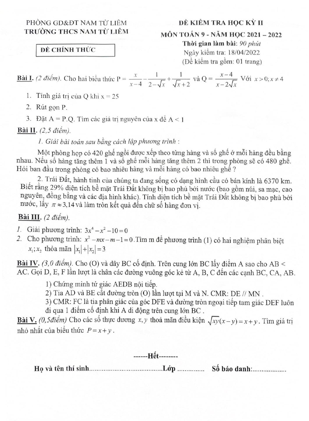 Đề thi học kì 2 lớp 9 môn Toán trường THCS Nam Từ Liêm, Hà Nội năm học 2021-2022