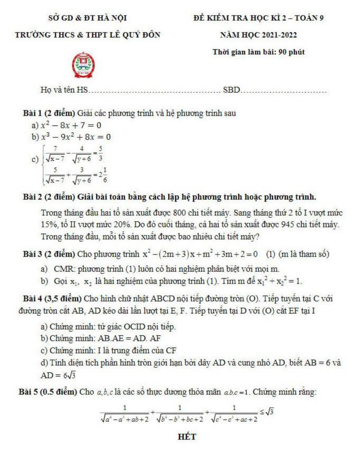 Đề thi học kì 2 lớp 9 môn Toán trường THCS&THPT Lê Quý Đôn, Hà Nội năm học 2021-2022