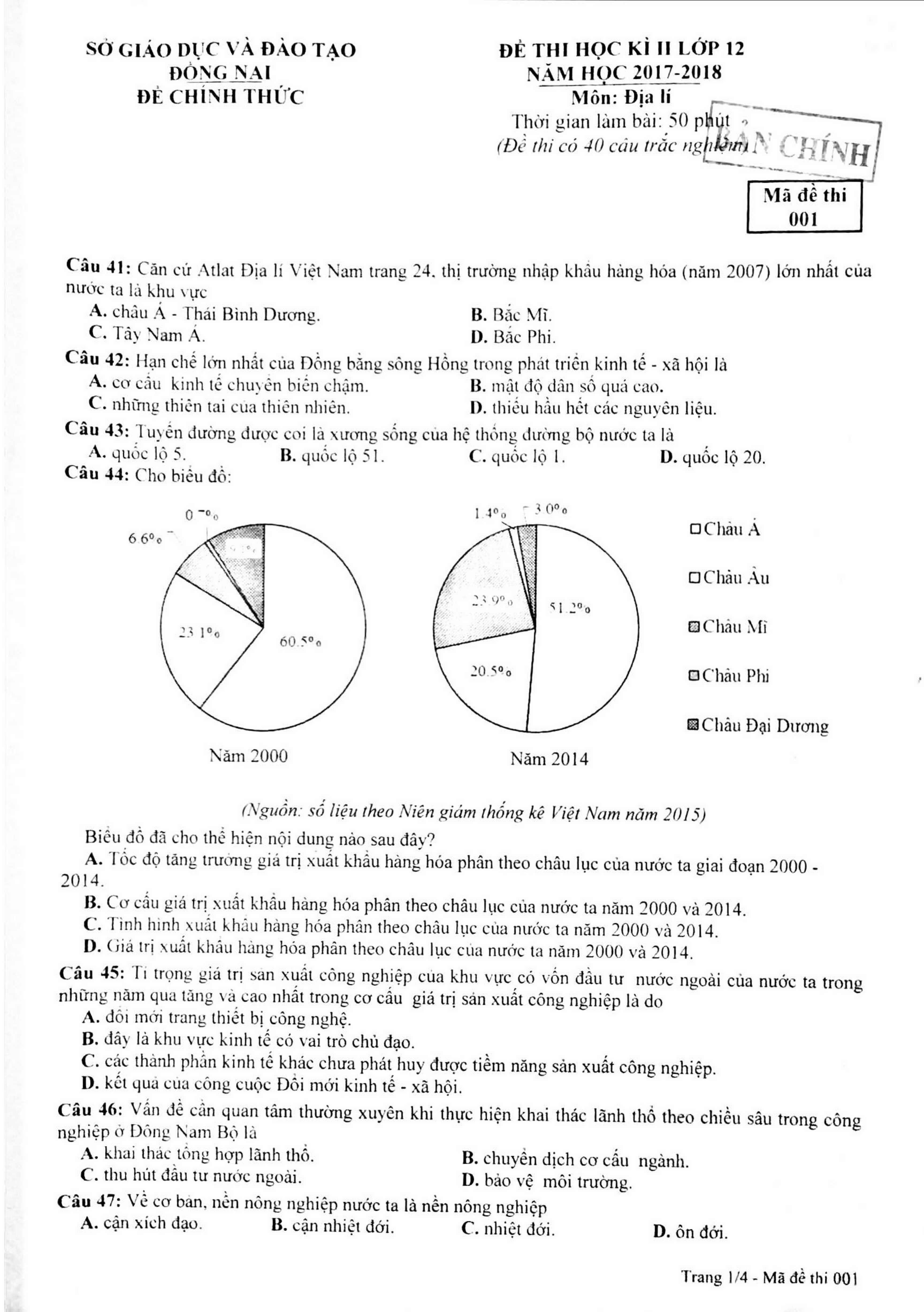 Đề thi học kì 2 môn Địa lý lớp 12 năm học 2017 - 2018 Sở GD&ĐT Đồng Nai