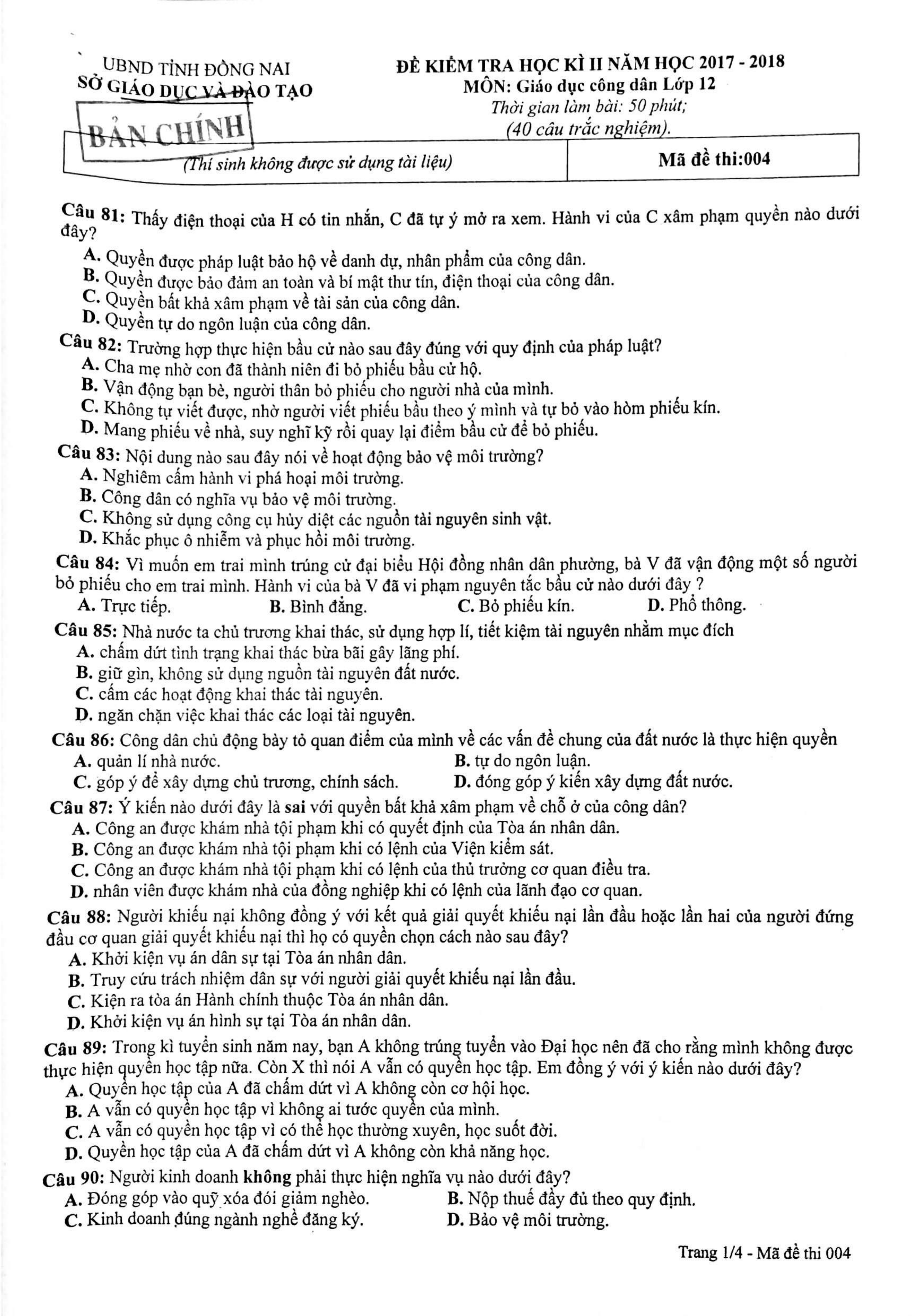 Đề thi học kì 2 môn GDCD lớp 12 năm học 2017 - 2018 Sở GD&ĐT Đồng Nai