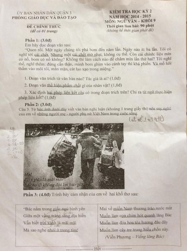 Đề thi học kì 2 môn Ngữ văn lớp 9 năm 2015 Quận 3, Thành phố Hồ Chí Minh