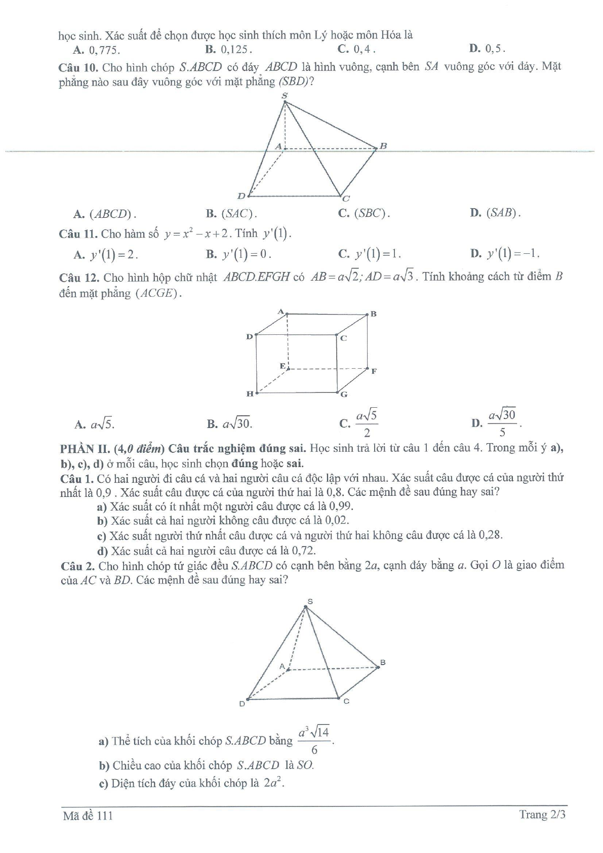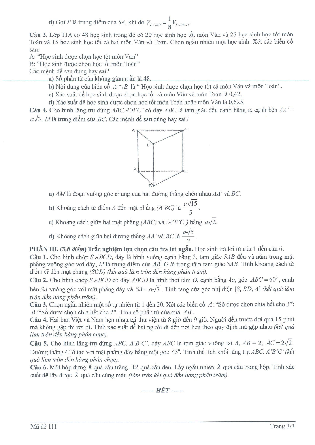 VnDoc.com xin gửi tới bạn đọc bài viết Đề thi học kì 2 môn Toán 11 trường THPT Nguyễn Quốc Trinh, Hà Nội năm 2024 để bạn đọc cùng tham khảo. Bài viết được tổng hợp gồm có 2 mã đề thi. Mỗi đề thi gồm có 3 phần với 12 câu hỏi trắc nghiệm có nhiều phương án chọn, 4 câu hỏi trắc nghiệm đúng sai, 6 câu hỏi trắc nghiệm trả lời ngắn. Thí sinh làm bài trong thời gian 90 phút. Đề được xây dưng theo cấu trúc đề thi tốt nghiệp 2025. Mời các bạn cùng theo dõi và tham khảo thêm đề thi các môn tại mục Thi học kì 2 lớp 11 nhé.
