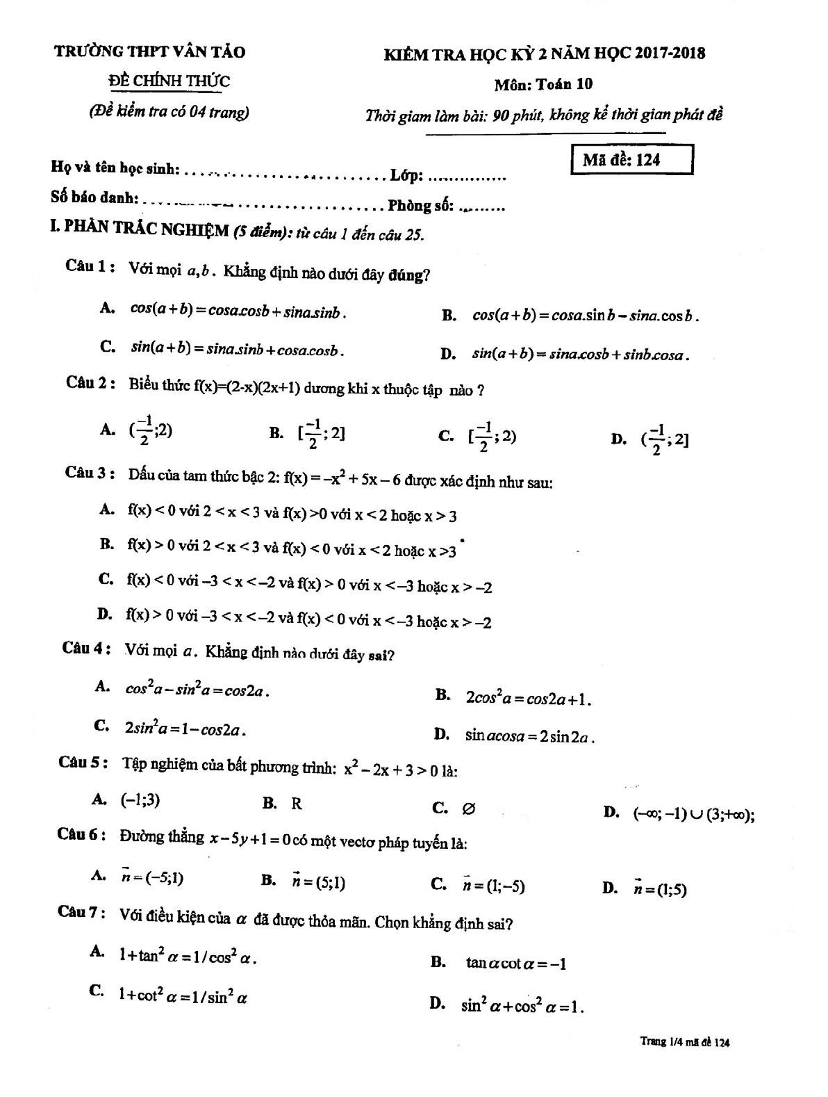 Đề thi học kì 2 môn Toán lớp 10 năm học 2017 - 2018 trường THPT Vân Tảo - Hà Nội