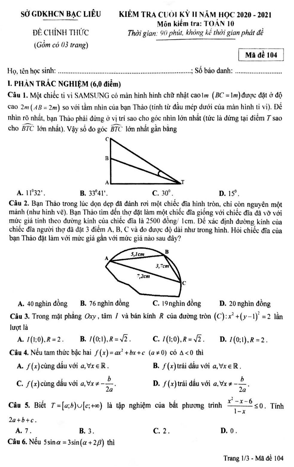 Đề thi học kì 2 môn Toán lớp 10 Sở GDKHCN Bạc Liêu năm 2021