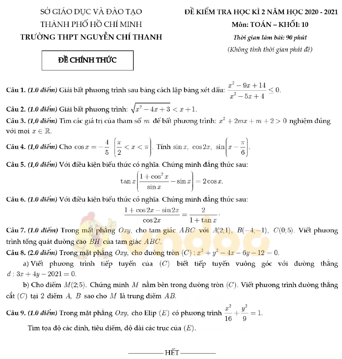 Đề thi học kì 2 môn Toán lớp 10 trường THPT Nguyễn Chí Thanh, TP HCM năm 2020-2021 vừa được VnDoc.com sưu tập và xin gửi tới bạn đọc. Mong rằng qua bài viết này các bạn có thêm tài liệu để ôn tập cho kì thi cuối học kì 2 sắp tới nhé. Mời các bạn cùng tham khảo và tải về tại đây nhé.