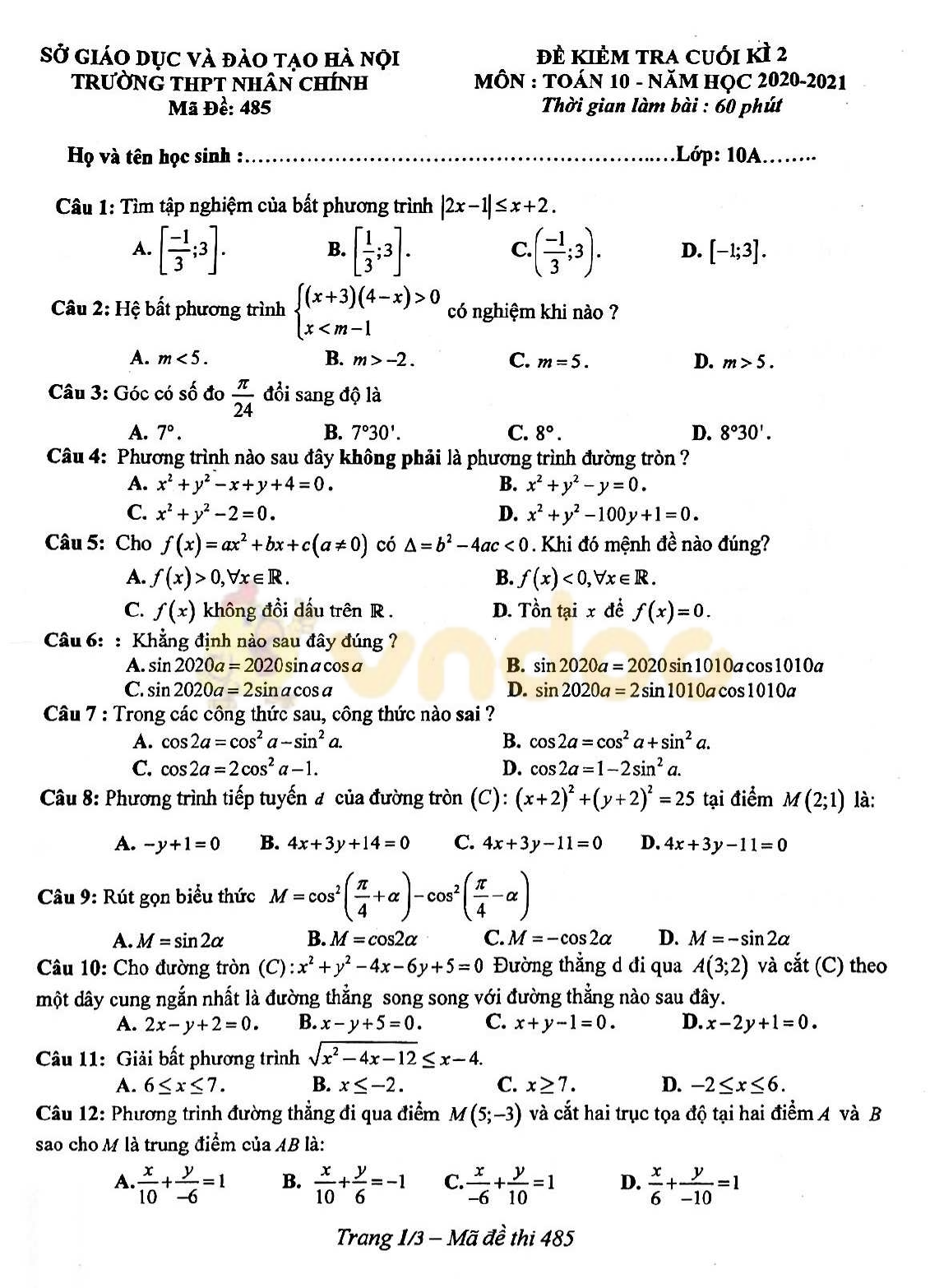 Đề thi học kì 2 môn Toán lớp 10 trường THPT Nhân Chính, Hà Nội năm 2020-2021 vừa được VnDoc.com sưu tập và xin gửi tới bạn đọc. Mong rằng qua bài viết này các bạn có thêm tài liệu để học tập và ôn tập cho thi học kì 2 sắp tới nhé. Mời các bạn cùng tham khảo chi tiết và tải về tại đây nhé.