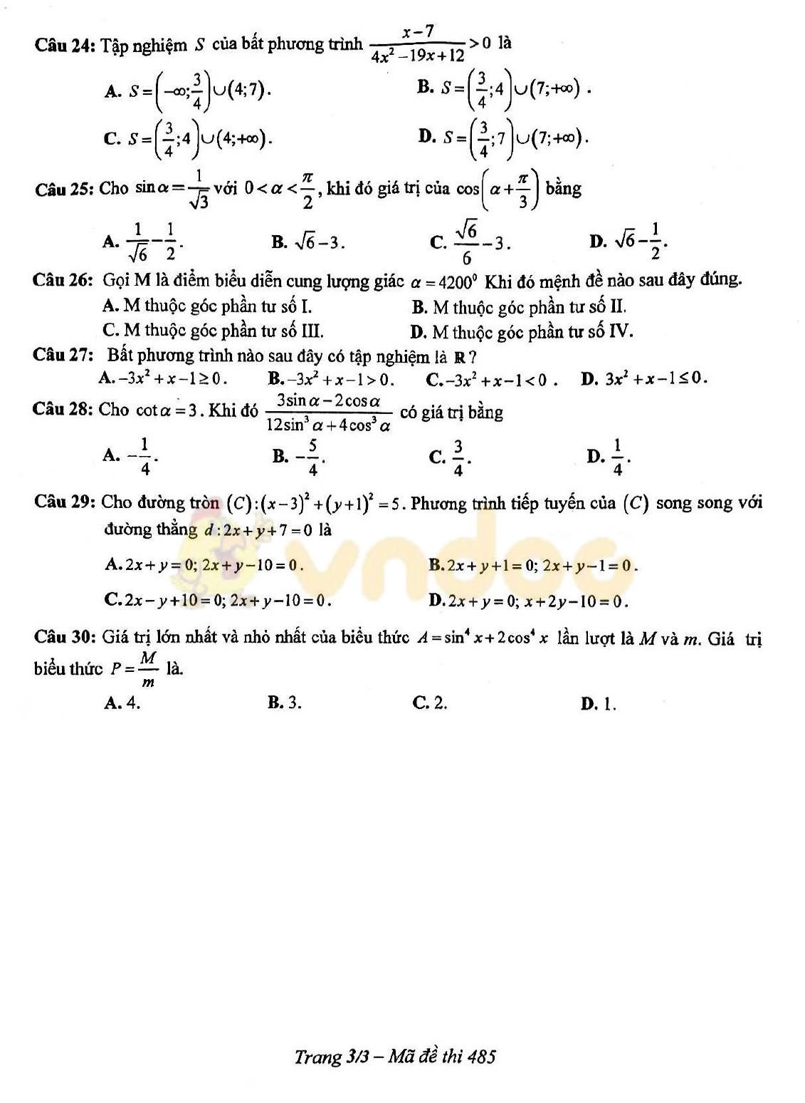 VnDoc.com xin gửi tới bạn đọc bài viết Đề thi học kì 2 môn Toán lớp 10 trường THPT Nhân Chính, Hà Nội năm 2020-2021 để bạn đọc tham khảo. Bài viết được tổng hợp gồm có 30 câu hỏi trắc nghiệm, thí sinh làm bài trong thời gian 60 phút. Mời các bạn cùng tham khảo chi tiết tại đây nhé.