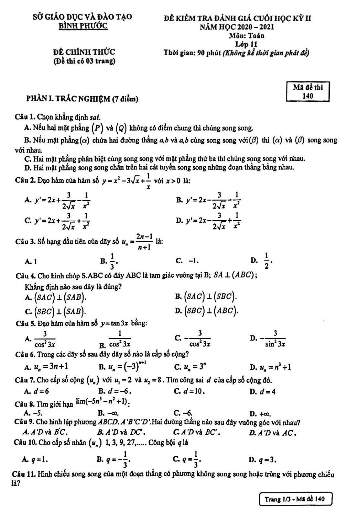Đề thi học kì 2 môn Toán lớp 11 Sở GD&ĐT Bình Phước năm 2020-2021