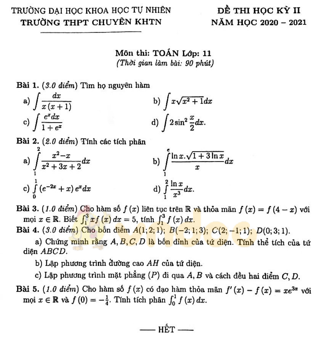 VnDoc.com xin gửi tới bạn đọc Đề thi học kì 2 môn Toán lớp 11 trường THPT Chuyên KHTN, Hà Nội năm 2020-2021 để các bạn cùng tham khảo. Đề thi được biên tập gồm có 5 câu hỏi tự luận, thí sinh làm bài trong thời gian 90 phút. Mời các bạn cùng tham khảo.
