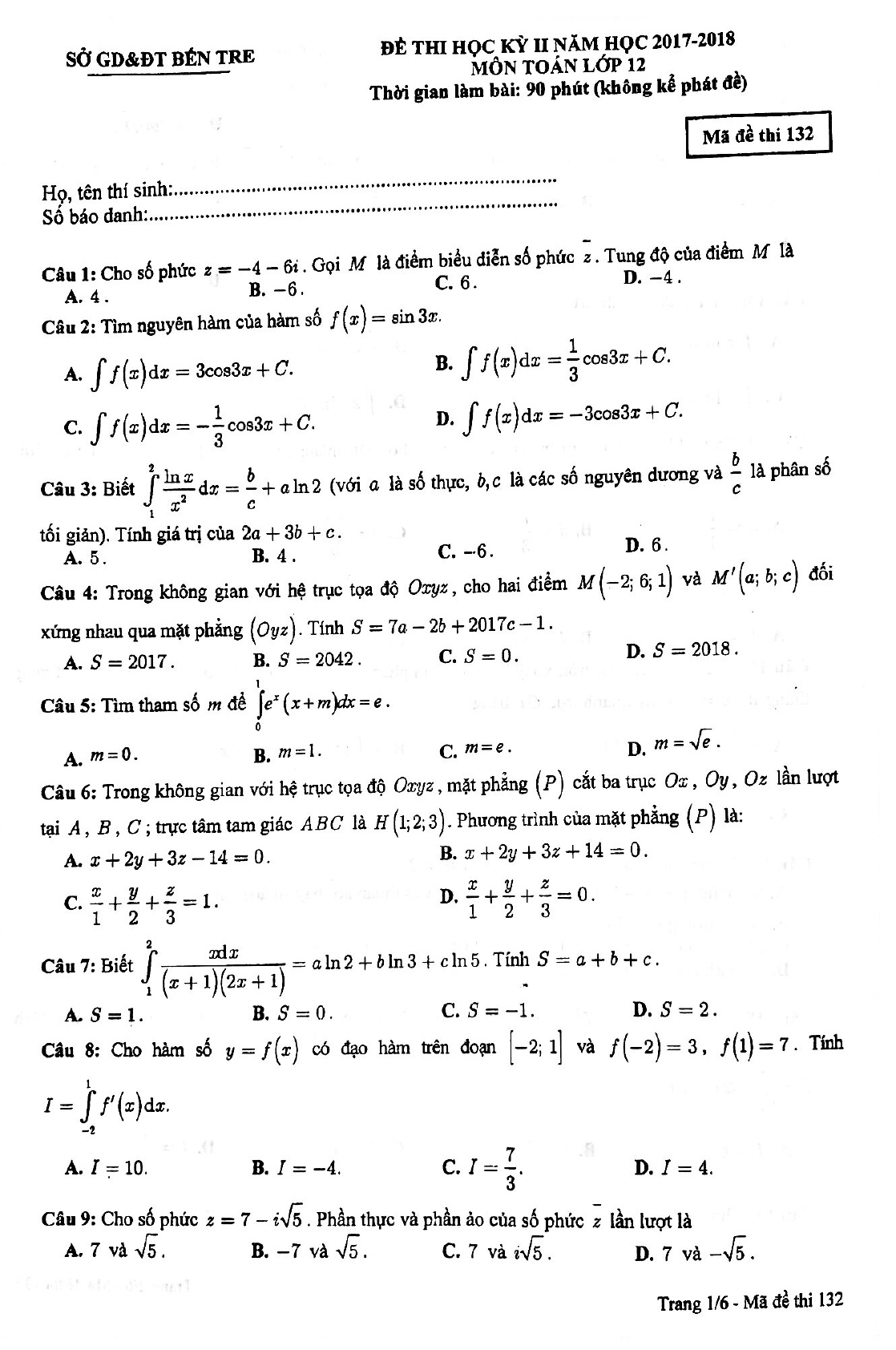 Đề thi học kì 2 môn Toán lớp 12 năm 2017 - 2018 Sở GD&ĐT Bến Tre