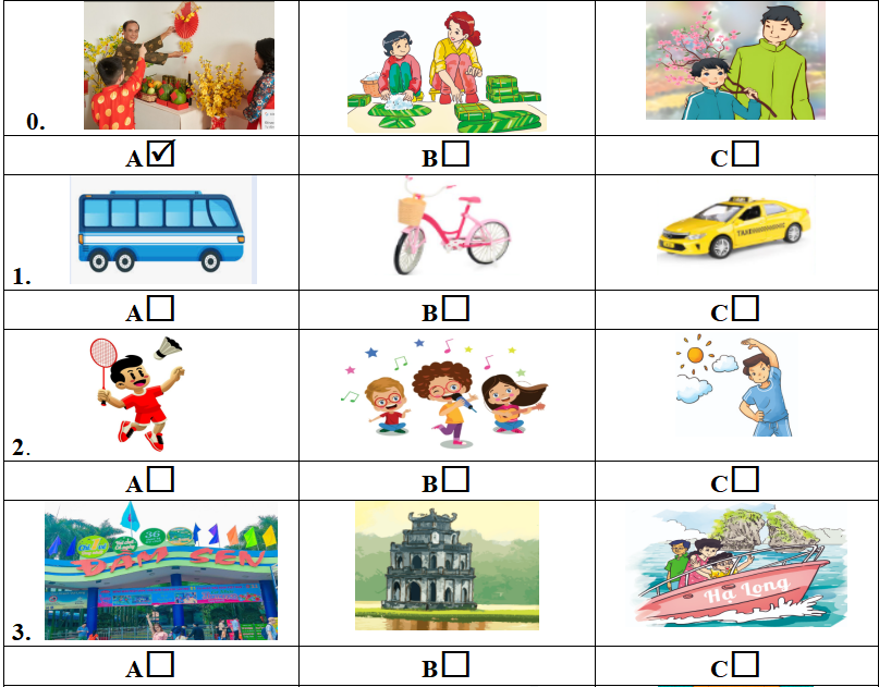 1. What drinks will you have at the party ? 2. What's the matter ? 3. How did Snow White cook ? 4. Where do you want to visit ? 5. How can I get to Hoan Kiem Lake ? |