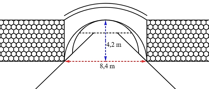 \(4,2\ m\). Mặt đường dưới cổng được chia thành hai làn đều nhau cho xe ra vào. Một chiếc xe tải rộng