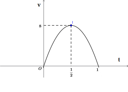 giờ với vận tốc v phụ thuộc vào thời gian t có đồ thị vận tốc như hình bên. Trong khoảng thời gian 1 giờ kể từ khi bắt đầu chuyển động, đồ thị đó là một phần của đường parabol có đỉnh