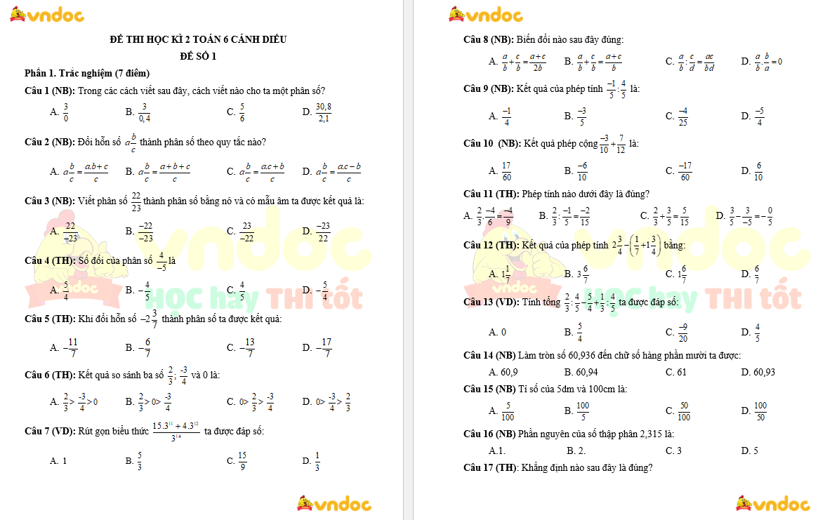 Đề kiểm tra học kì 2 Toán 6 Cánh diều 2023 - 2024 Đề số 1 do VnDoc biên soạn, có đầy đủ đáp án cho các em tham khảo luyện tập. Đề thi dưới đây bám sát chương trình học có đáp án và bảng ma trận để các em học sinh cùng củng cố chuẩn bị cho bài thi học kì 2 lớp 6.