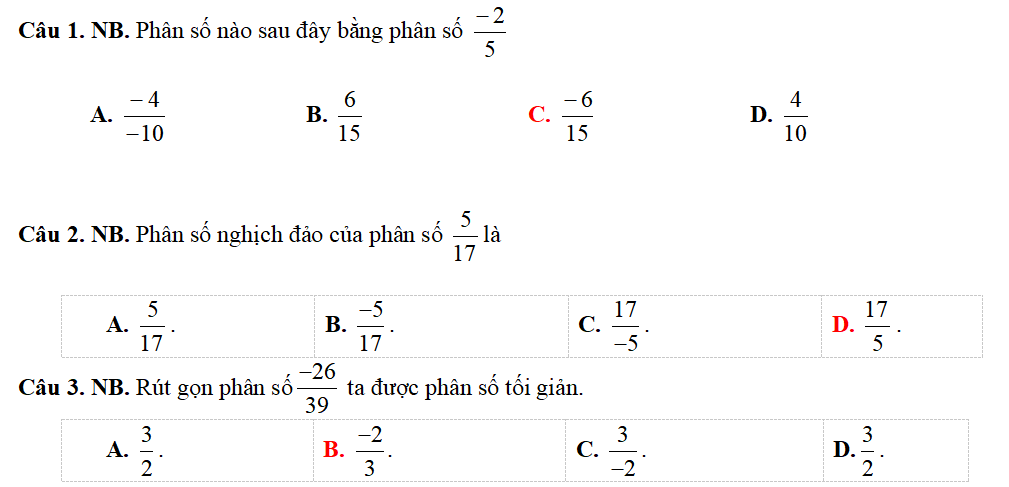 Câu 1. Phân số bằng phân số