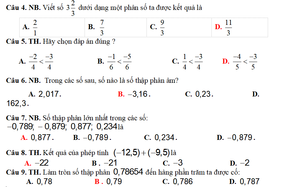 Nhận biết – Nhận biết được số thập phân âm ( Câu 7) |