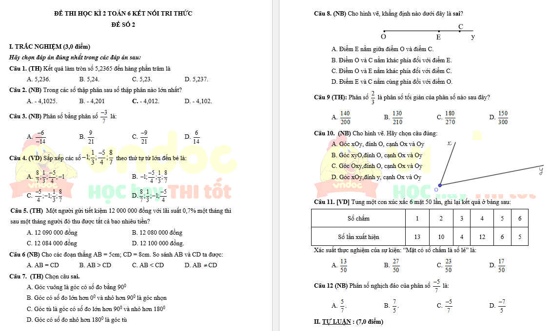 Đề kiểm tra học kì 2 Toán 6 Kết nối tri thức năm 2023 - 2024 Đề số 2 do VnDoc biên soạn, có đầy đủ đáp án cho các em tham khảo luyện tập. Đề thi dưới đây bám sát chương trình học có đáp án và bảng ma trận để các em học sinh cùng củng cố chuẩn bị cho bài thi học kì 2 lớp 6.