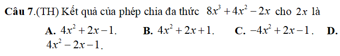 Câu 9. (TH): Sắp xếp đa thức 6x3 + 5x4 – 8x6 – 3x2 + 4 theo lũy thừa giảm dần của biến ta được: