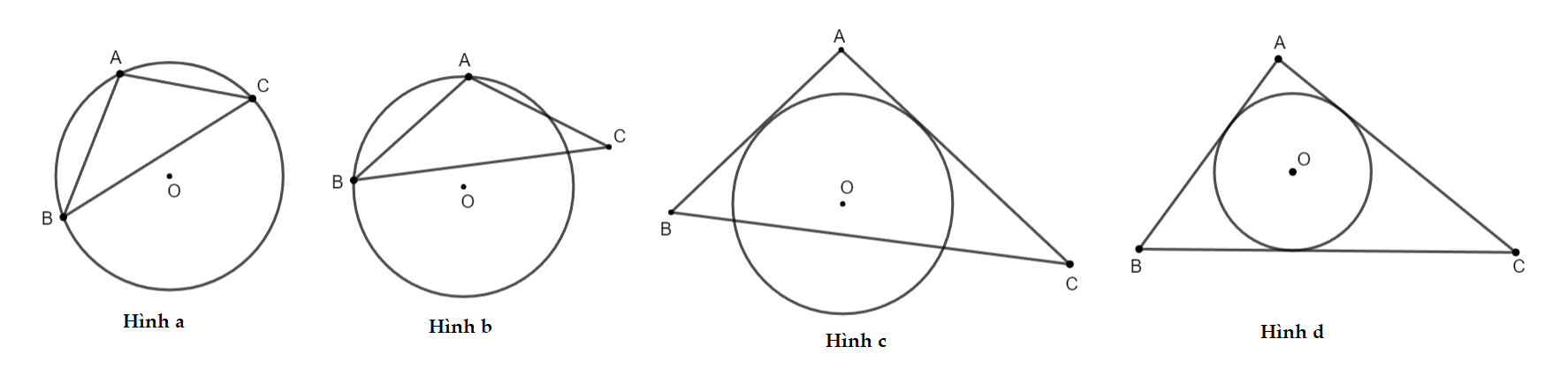 Câu 14 (NB). Cho hình vẽ sau. Hình nào có đường tròn tâm O nội tiếp tam giác
