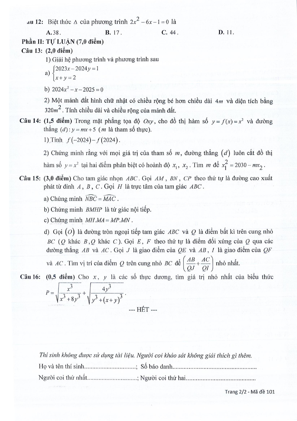 Đề thi học kì 2 Toán 9 Sở GD&ĐT Hà Nam năm 2023 - 2024