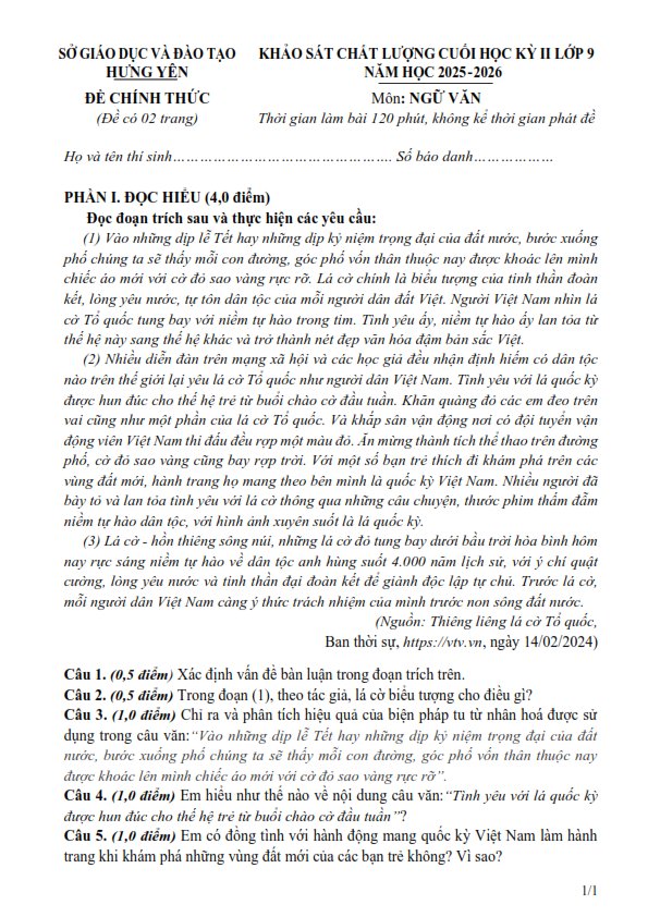 1. Đề thi học kì 2 Văn 9 Sở GD&ĐT Hưng Yên năm 2025 - 2026