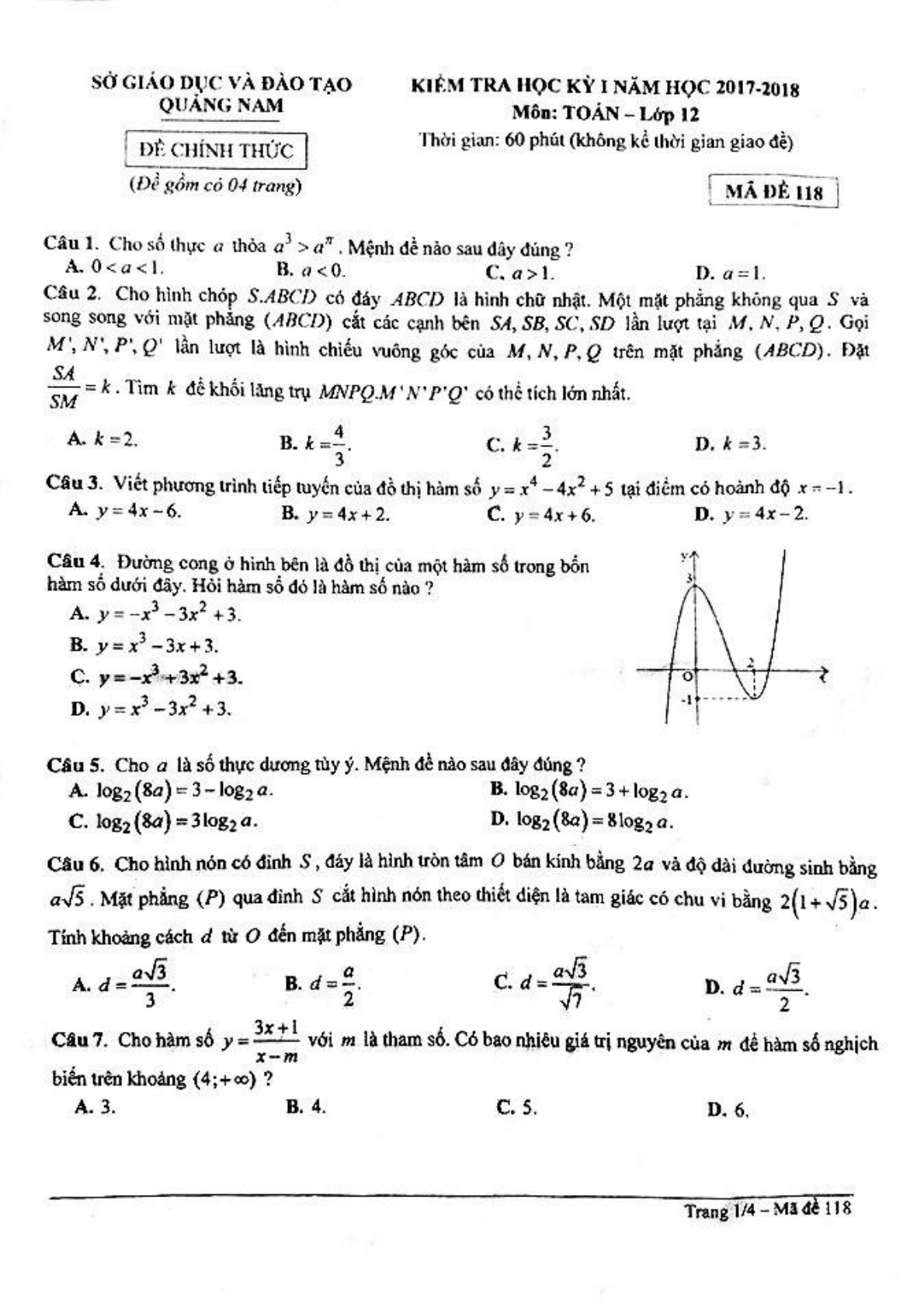 Đề thi học kỳ 1 môn Toán lớp 12 năm học 2017 - 2018, Sở GD&ĐT Quảng Nam