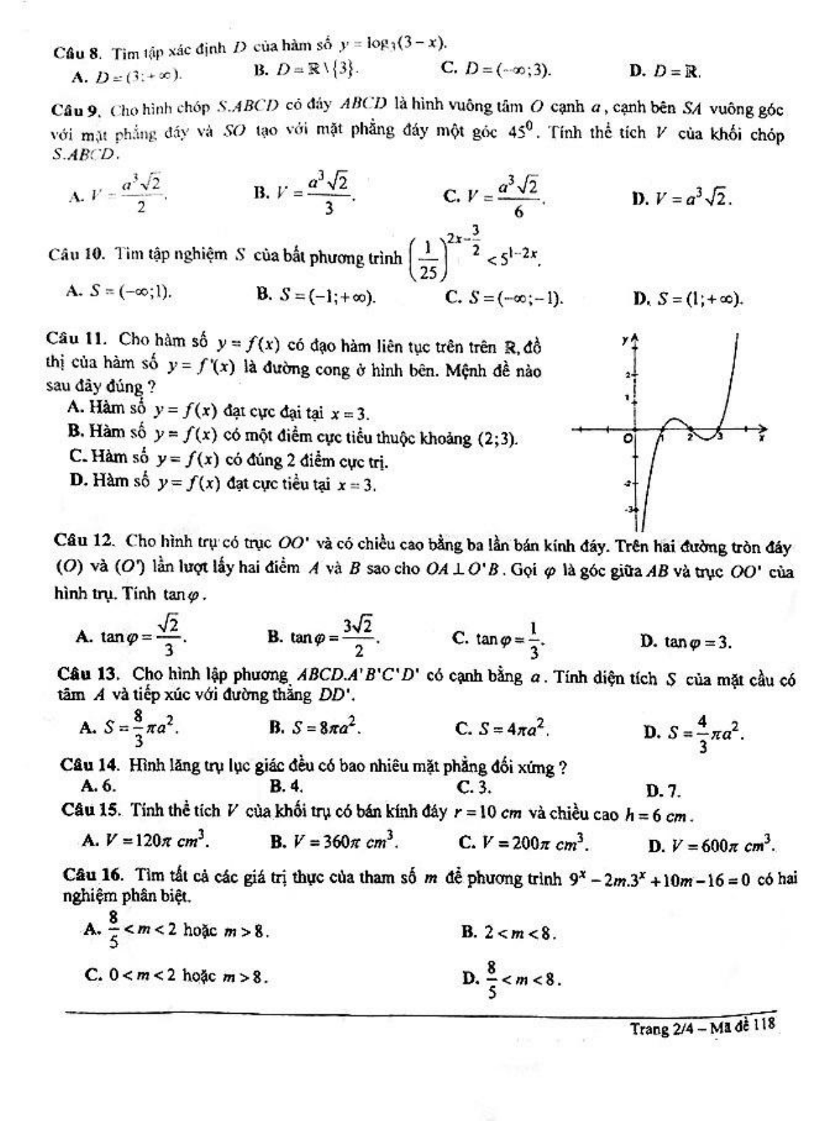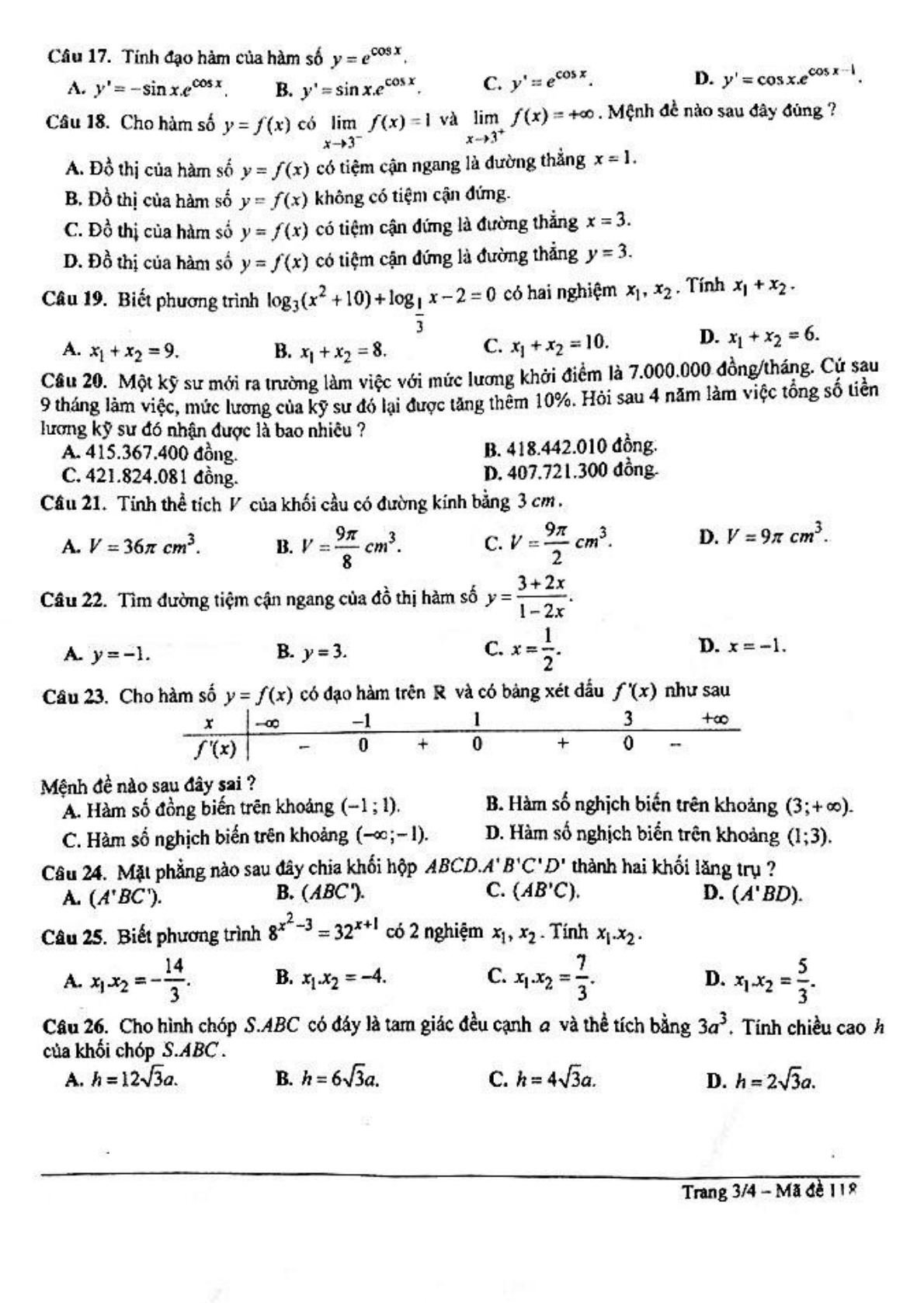 Đề thi học kỳ 1 môn Toán lớp 12 năm học 2017 - 2018, trường THPT Phan Đình Phùng - Hà Tĩnh