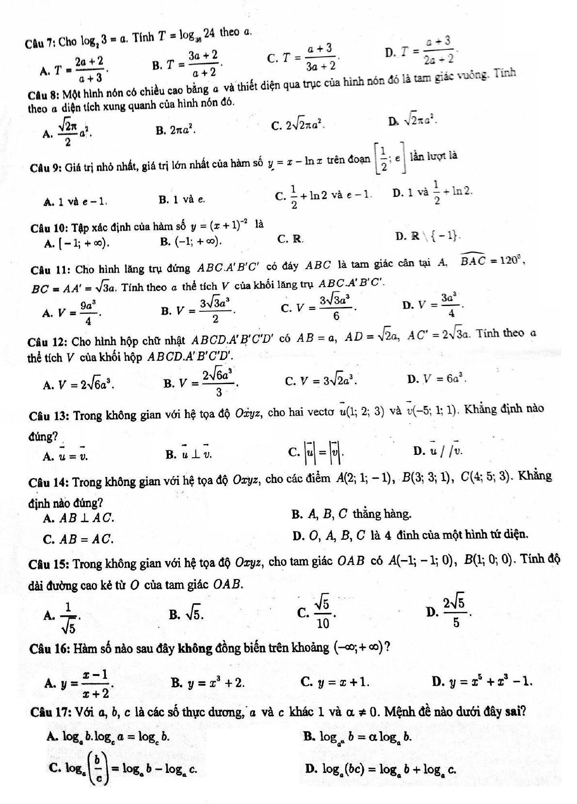 Đề thi học kỳ 1 môn Toán lớp 12 năm học 2017 - 2018, trường THPT chuyên Đại học Vinh