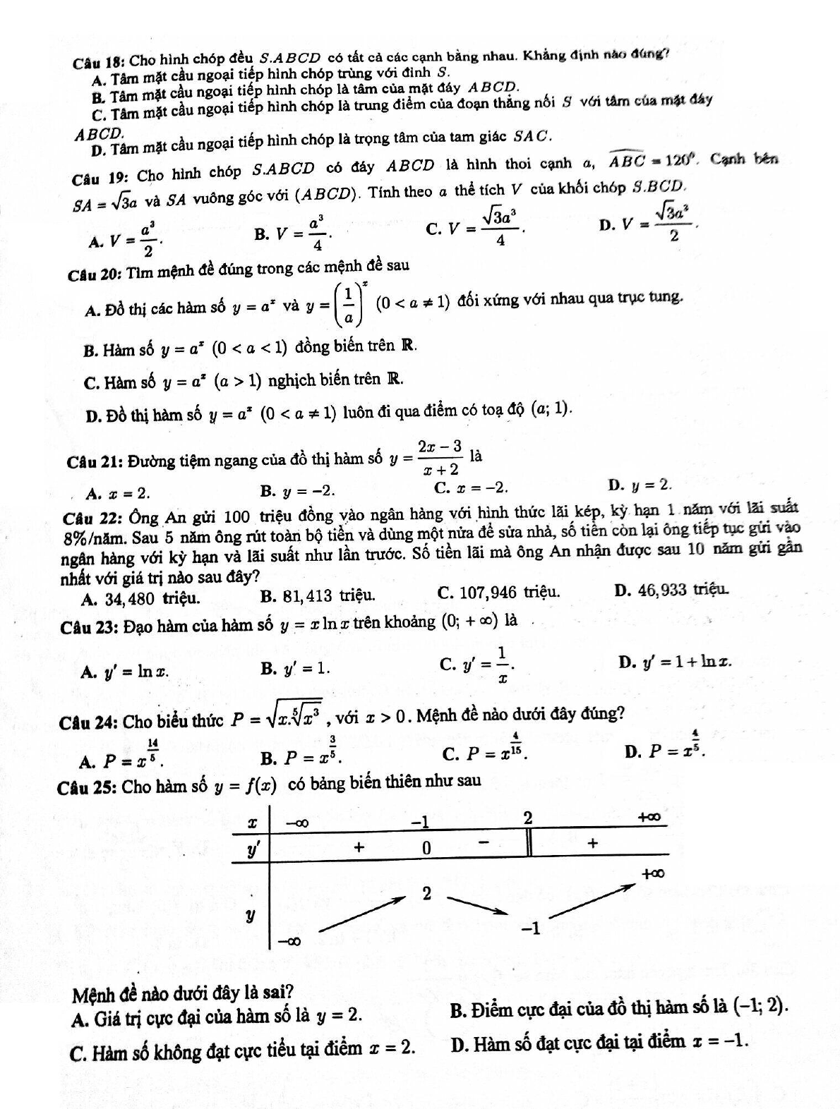 Đề thi học kỳ 1 môn Toán lớp 12 năm học 2017 - 2018, trường THPT Thạch Thành 1 - Thanh Hóa