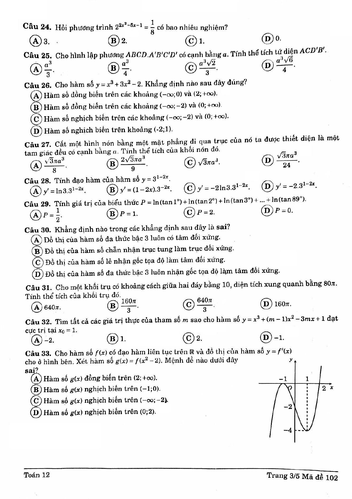 Đề thi học kỳ 1 môn Toán lớp 12