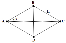 Bốn hạt nhỏ A, B, C, D có cùng khối lượng m và đều mang điện tích dương, được nối với nhau bằng bốn sợi dây mảnh có cùng chiều dài L trong không khí. Các dây không giãn, khối lượng của dây không đáng kể. Từng cặp hai hạt A và C, B và D có điện tích bằng nhau. Biết điện tích của mỗi hạt A, C bằng q. Khi hệ cân bằng, bốn điện tích ở bốn đỉnh của hình thoi ABCD có góc ở các đỉnh A, C là 2α (hình vẽ). Bỏ qua tác dụng của lực hấp dẫn và lực cản của môi trường.