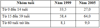 Cơ cấu dân số nước ta phân theo nhóm tuổi trong hai năm 1999 và 2005 (đơn vị: %)