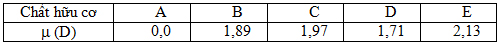 2. Có 5 chất hữu cơ với các giá trị mômen lưỡng cực tương ứng như sau: