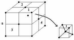 Kim cương có cấu trúc tinh thể lập phương tâm diện với cạnh a của ô mạng cơ sở bằng 3,567 Å, ngoài ra trong mỗi ô mạng cơ sở còn có thêm 4 nguyên tử C chiếm 4 tâm của 4 hình lập phương con 1;2;3;4. Nếu ô mạng cơ sở được chia thành 8 hình lập phương con với cạnh là a/2. Mỗi nguyên tử C trong tinh thể liên kết với 4 nguyên tử C gần nhau nhất bằng các obitan lai hóa sp3.