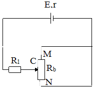 Cho mạch điện như hình vẽ. Biết: E=12V, r =1, biến trở Rb có điện trở toàn phần RMN, R1=2,5Ω. Dịch chuyển con chạy C đến vị trí để công suất tiêu thụ của toàn biến trở cực đại. Tìm giá trị của công suất cực đại này.