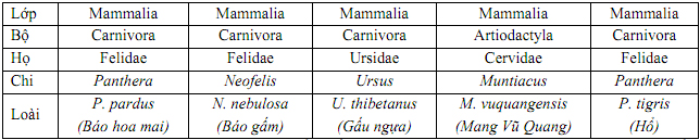 Bảng dưới đây mô tả hệ thống phân loại của 5 loài thú khác nhau ở Việt Nam: