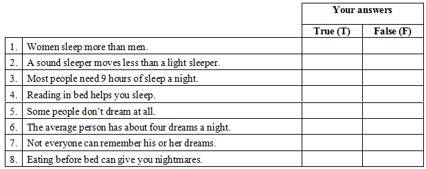 Part II. You are going to hear an expert talk about sleeping and dreaming. Listen and write True (T) or False (F) for each sentence. You are allowed to listen TWICE.