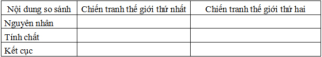 Lập bảng so sánh giữa cuộc Chiến tranh thế giới thứ nhất (1914-1918) với cuộc Chiến tranh thế giới thứ hai (1939-1945) theo mẫu sau: