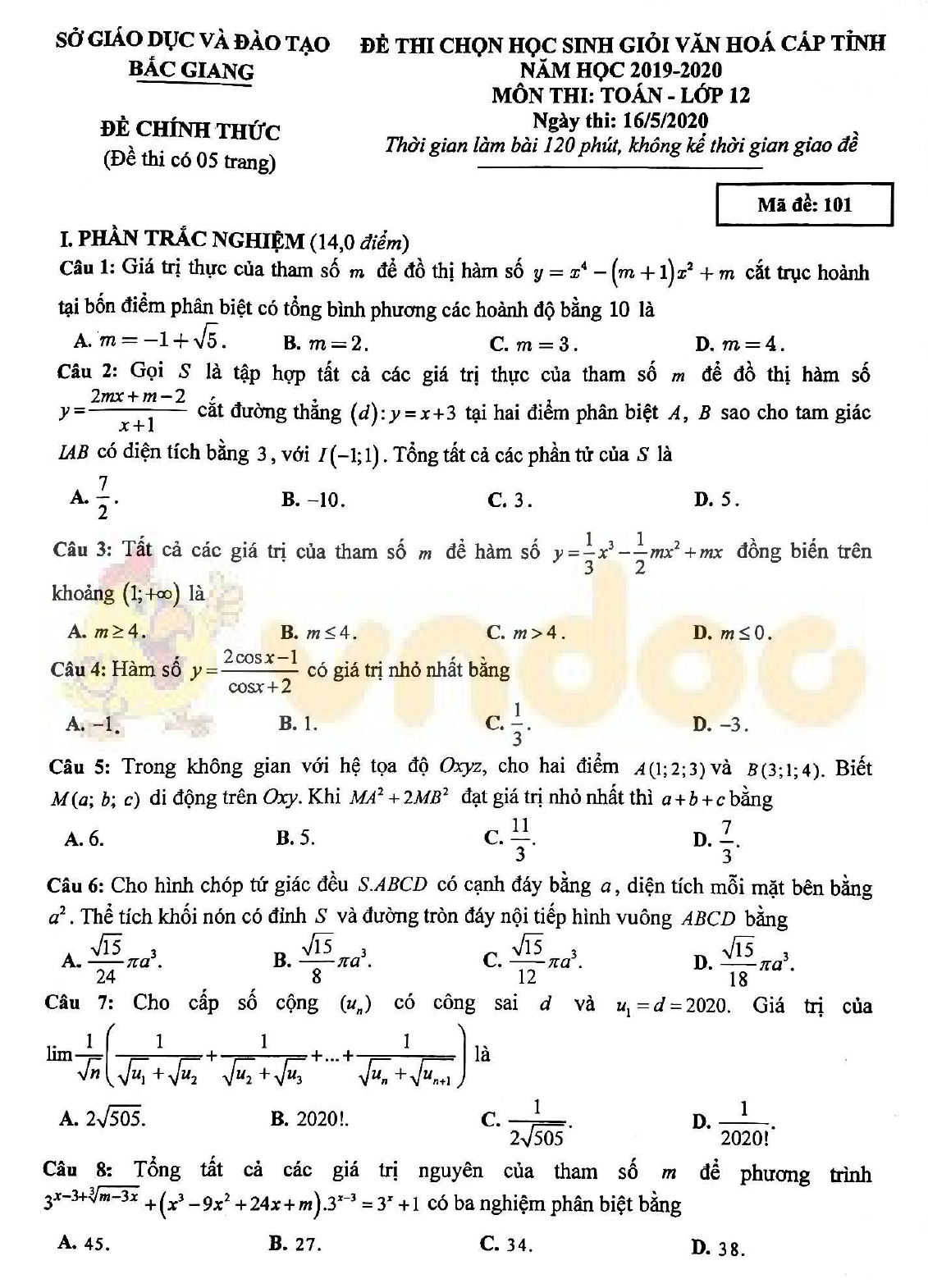 Đề thi học sinh giỏi lớp 12 môn Toán năm 2019-2020 Sở GD&ĐT Bắc Giang vừa được VnDoc.com sưu tập và xin gửi tới bạn đọc cùng tham khảo. Mong rằng qua bài viết này các bạn có thêm tài liệu để học tập và ôn thi cho kì thi học sinh giỏi sắp tới nhé. Mời các bạn cùng tham khảo chi tiết tại đây.