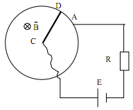 Hình bên là sơ đồ một mẫu động cơ điện đơn giản. Một vòng dây dẫn hình tròn tâm C bán kính l nằm ngang cố định trong một từ trường đều thẳng đứng có cảm ứng từ B. Một thanh kim loại CD dài l, khối lượng m có thể quay quanh trục thẳng đứng đi qua C, đầu kia của thanh kim loại trượt có ma sát trên vòng tròn. Một nguồn điện suất điện động E nối vào tâm C và điểm A trên vòng tròn qua điện trở R.