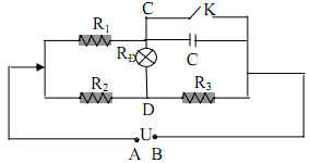 Cho mạch điện như hình vẽ, trong đó R1 = R2 = 5Ω; R = 90 Ω; tụ điện có điện dung C = 2Fμ; Điện trở khóa K và các dây nối không đáng kể; hiệu điện thế ở hai đầu đoạn mạch U = 90V không thay đổi. Biết rằng khi K ngắt và K đóng đèn đều sáng bình thường.