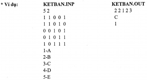 * Dữ liệu vào: Cho trong file văn bản KETBAN.INP. Hàng đầu tiên ghi giá trị của N. N hàng kế tiếp biểu diễn bảng vuông A; các số trên đường chéo chính bằng 1. Các số cách nhau ít nhất 1 khoảng trắng. N hàng tiếp theo ghi nhận danh sách học sinh trong lớp, mỗi hàng gồm số thứ tự học sinh, sau số thứ tự là tên của học sinh; tên của học sinh là 1 chuỗi kí tự liên tục (từ A đến Z hoặc từ a đến z), không có khoảng trắng. Số thứ tự và tên cách nhau bởi dấu "-".