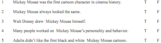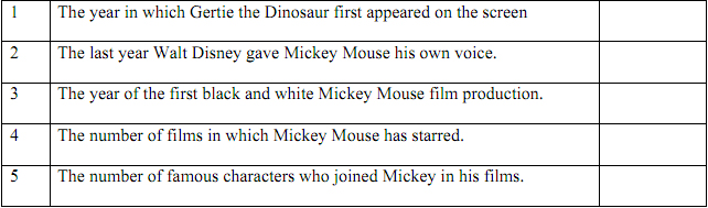 Task 1: Imagine that you are visitor at DisneyWorld in California. Listen to the tour guide talking about Mickey Mouse and complete the table below (1pt).