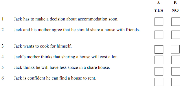 Task 3: Look at the six sentences for this part. You will hear a conversation between a teenage boy, Jack and his mother, about accommodation for Jack at university. (1.5pts)