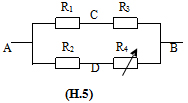 Cho mạch điện có sơ đồ như hình vẽ (H.5). Cho biết: R1 = 16Ω; R2 = R3 = 24Ω, R4 là một biến trở. Bỏ qua điện trở của các dây nối. Đặt vào hai đầu A, B của mạch điện một điện áp UAB = 48V.