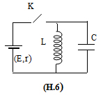 Cho mạch dao động gồm một tụ điện và một cuộn dây được nối với một bộ pin có điện trở trong r qua một khóa điện như hình vẽ (H.6). Ban đầu khóa K đóng. Khi dòng điện đã ổn định, người ta ngắt khóa và trong khung có dao động điện với tần số f. Biết rằng điện áp cực đại giữa hai bản tụ điện lớn gấp n lần suất điện động E của bộ pin. Bỏ qua điện trở thuần của các dây nối và cuộn dây. Hãy tính điện dung và hệ số tự cảm của cuộn dây.
