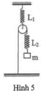 Cho hệ vật như hình 5. Các lò xo L1 và L2 có độ cứng tương ứng là k1, k2. Bỏ qua ma sát, khối lượng của các lò xo và ròng rọc. Biết vật có khối lượng m, gia tốc rơi tự do là g. Kéo vật xuống dưới vị trí cân bằng một đoạn nhỏ x0 theo phương thẳng đứng rồi buông ra không vận tốc đầu.