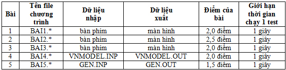 Dấu (*) trong tên file chương trình được thay thế bằng PAS hoặc CPP tuỳ theo thí sinh viết chương trình bằng ngôn ngữ Pascal hoặc C++. Ví dụ, nếu học sinh viết bằng ngôn ngữ Pascal thì tên các bài lần lượt là BAI1.PAS, BAI2.PAS, BAI3.PAS, BAI4.PAS, BAI5.PAS