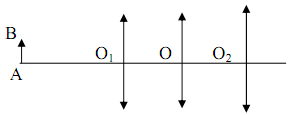 Cho hệ hai thấu kính hội tụ mỏng O1, O2 đặt đồng trục cách nhau 1 khoảng O1O2 = 70cm. Vật sáng AB đặt vuông góc với trục chính trước O1 và cách O1 một đoạn d1 = 45cm. Ảnh cuối cùng cho bởi hệ ở sau O và cách O một đoạn 255cm. Nếu đặt thêm một thấu kính hội tụ O có tiêu cự f0 vào giữa hai thấu kính O1 và O2 thì thấy có hai vị trí của thấu kính O thỏa mãn tính chất sau: